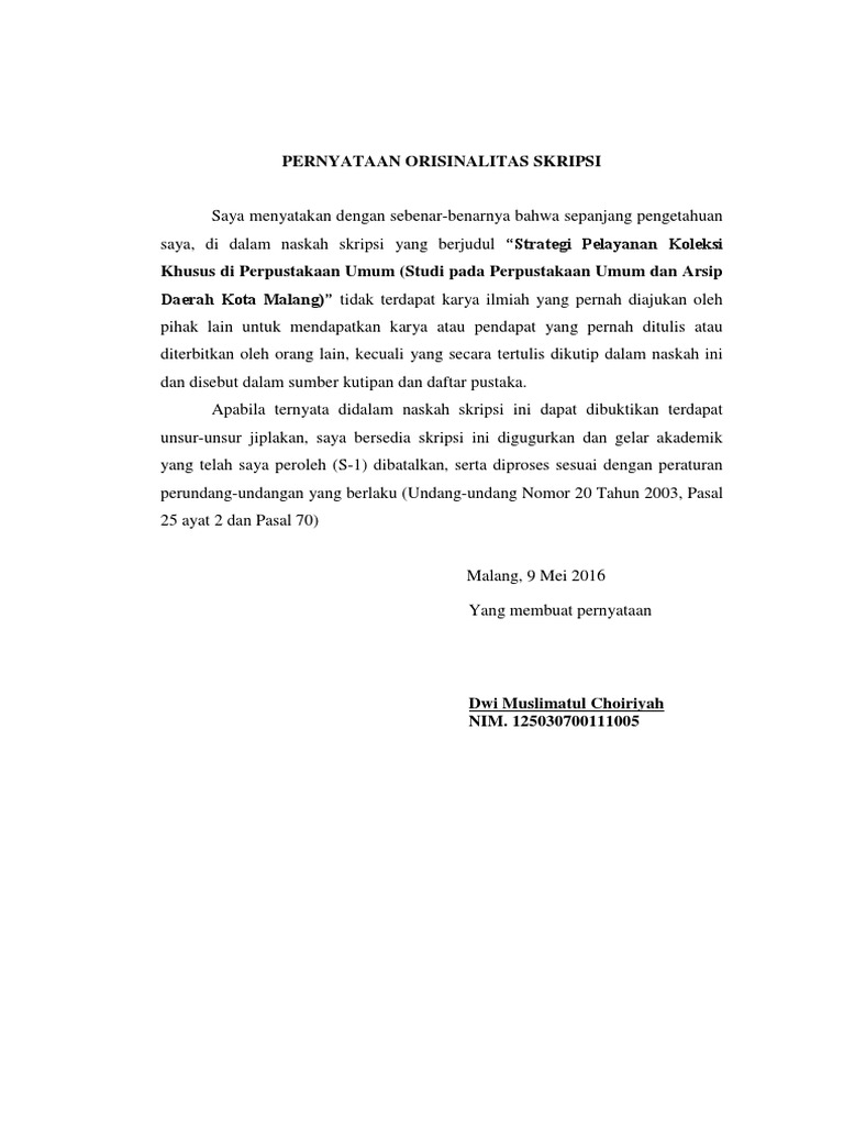 Surat Pernyataan Skripsi from imgv2-1-f.scribdassets.com Surat keterangan / pernyataan telah melakukan pkl dari. Skripsi disusun dengan cara dan format sesuai dengan peraturan yang.